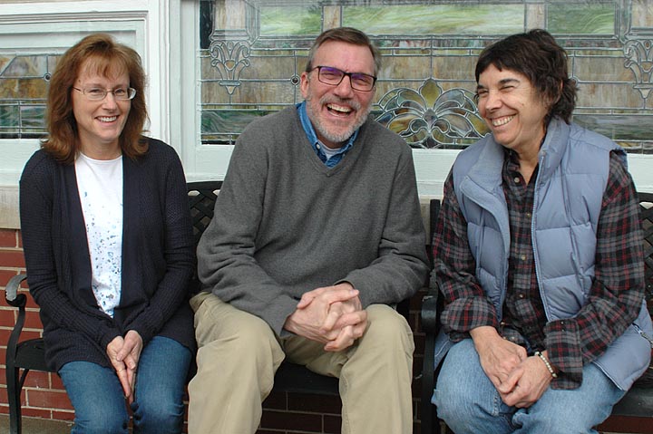A new volunteer initiative called PORCH aims to collect food items from villagers’ homes to donate to the Yellow Springs Community Food Pantry. The local PORCH effort is organized by Libby Hammond, left, with support from Pastor Rick Jones, of United Methodist Church, where the pantry is located, and the pantry’s director, Paula Hurwitz. (Photo by Audrey Hackett)