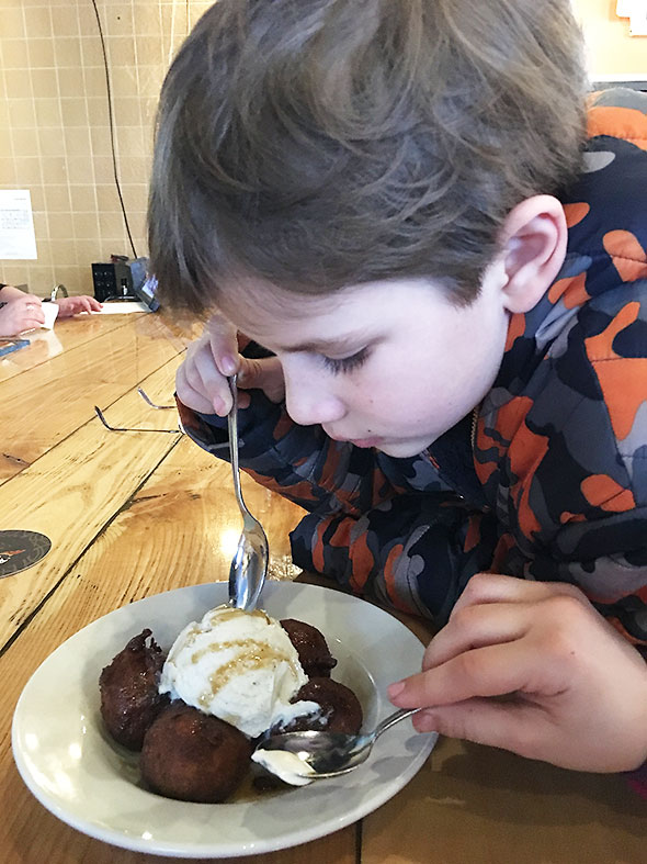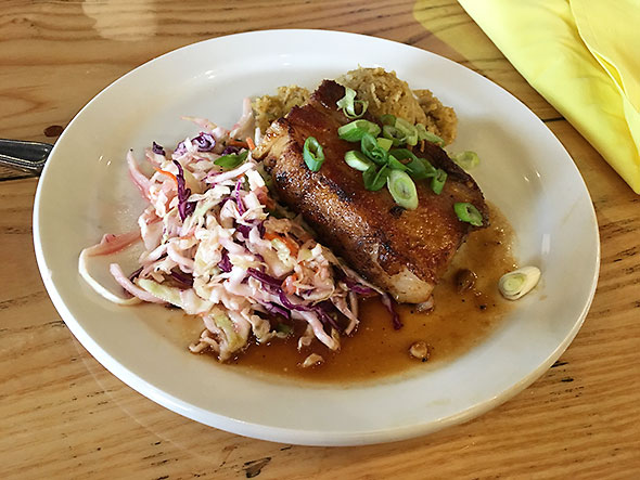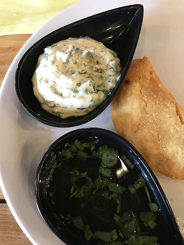 We were never at a loss…well attended and well fed. And in good company. The empanadas—filled to order with beef, chicken or beans—arrived early. We ordered another round of the pleasing hand-held pies and accompaning dips. My pork belly was a lovely piece of meat and the kids’ chicken disappeared as they ate with gusto. Around us, I checked in with folks who had come to check out the vegan and gluten free dishes finding them happy and content.