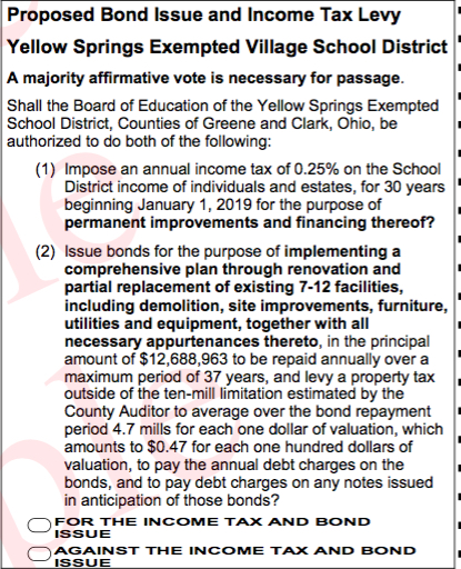 On Tuesday, May 8, residents of the Yellow Springs Exempted Village School District will vote on a combined property tax and income tax bond levy for the renovation and replacement of the local middle school and high school. A 4.7-mill property tax levy and 0.25 percent income tax will pay for $18.5 million of facility improvements.