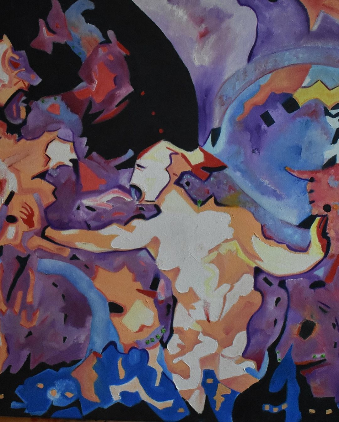 “Buck Truitt is an abstract/expressionist/surrealist painter and photographer who has lived in Yellow Springs for over 40 years. Born and raised in Seamen, Ohio, Buck grew up excelling in sports. After being honorably discharged from the Navy during Vietnam for being a conscientious objector to the war, he traveled throughout the country living in various places from San Francisco to South Carolina before settling down in Yellow Springs. Buck has been an artist and more specifically, a painter, for over 35 years.