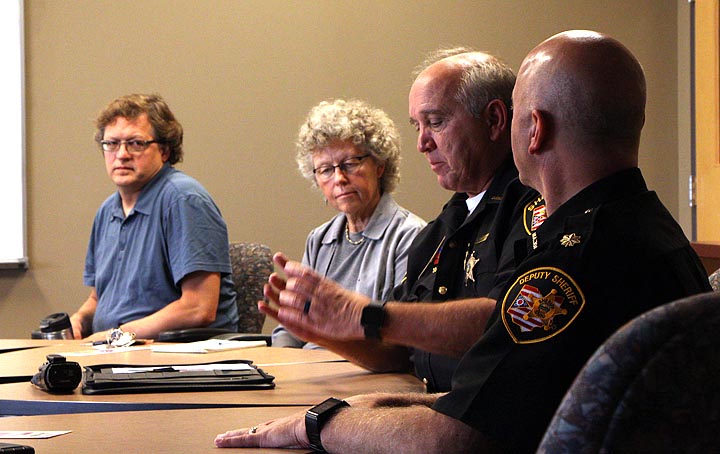 Greene County Sheriff Gene Fischer and Maj. Kirk Keller raised concerns about the deterioration of the county jail at the James A. McKee Group meeting, held at Antioch University Midwest recently. From left: Jonathan Platt, Yellow Springs Mayor Pam Conine, Sheriff Fischer, Maj. Keller. (Photo by Morgan Beard)