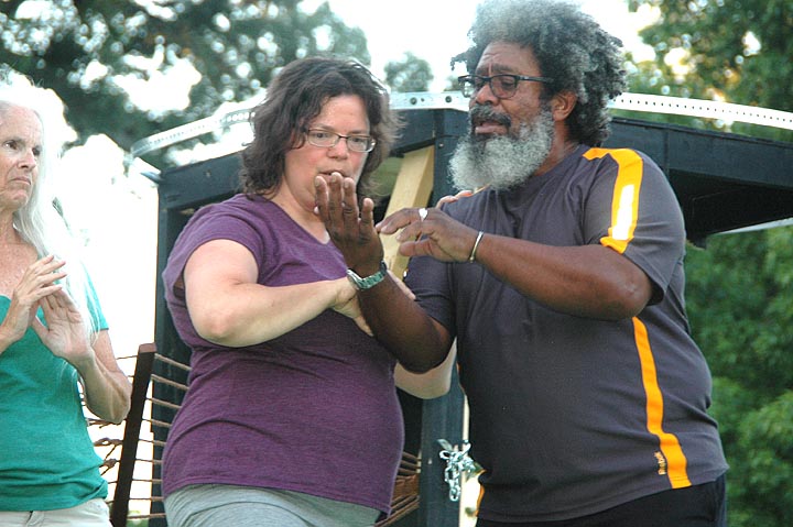 Continuing the tradition of presenting Shakespeare under the stars, the Yellow Springs Theater Company will present “A Midsummer Night’s Dream” this weekend and next, July 13–14 and 20–21, at 8 p.m., on the grounds behind Mills Lawn School. At a recent rehearsal, from left, villagers Ali Thomas, who plays Fairy Queen Titania; Amy Magnus, the fairy Cobweb; and Brian Upchurch, who as Nick Bottom finds himself in a temporary lamentable circumstance. (Photo by Carol Simmons