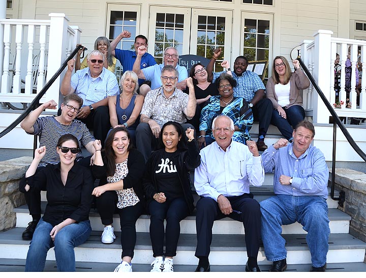 Taking a break from their retreat on the stairs of the Mills Park Hotel are representatives from community development corporations across Ohio. From left, top row, are Suzanne Parks and Nate Coffman of the OCDCA, Tom Reed of Gallia Meigs Community Action Agency, OCDCA Vice President and Home, Inc. Executive Director Emily Seibel, Jamar Doyle of Collinwood and Nottingham Villages Development Corporation and Melissa Miller of OCDCA; middle row, Al Norris of Adams Brown Community Action Partnership, Bambi Baughn of Community Action Commission of Fayette County, Don Corley of WSOS Community Action and Judy Jackson of the National Equity Fund; bottom row, Julie Sparks of ICAN Housing, Lisa Much of OCDCA, Alana Perez of OCDCA, Theresa Saelim of PNC Bank, Steve Torsell of Homes on the Hill CDC and Larry Fisher of ACEnet. (photo by Megan Bachman)