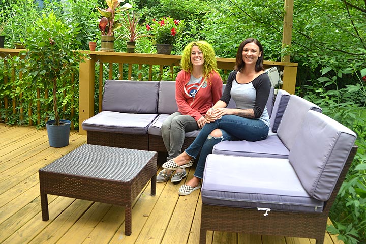 Brittany Baum, left, and Rachel Price, shown here on Baum’s backyard deck, are co-organizers of the first Yellow Springs Porchfest, to take place Saturday, Oct. 6, from noon to 7 p.m. At the event, local musicians will play for free on villagers’ porches, decks and yards. (Photo by Diane Chiddister)