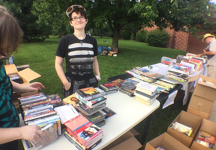 Ember McDonald of Yellow Springs browsed through used books and CDs at the 38th annual YS Book Fair, held last weekend at Mills Lawn.