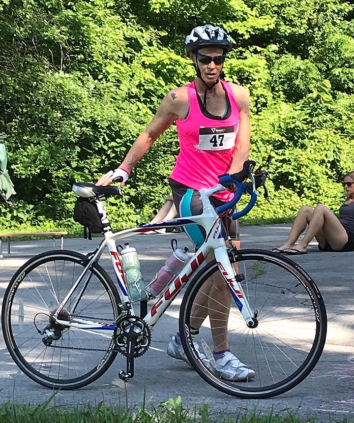 Villager Diana Castellano, pictured here in a recent race, has qualified to compete in multiple biking and swimming events as well as the triathlon competition at the 2019 National Senior Games, popularly called the Senior Olympics, to be held in June in Albuquerque, N.M. Longtime Yellow Springs resident Cheryl Meyer, not pictured, qualified to compete in four swimming events. Both women swim with the Dayton Sharks team. (submitted photo)