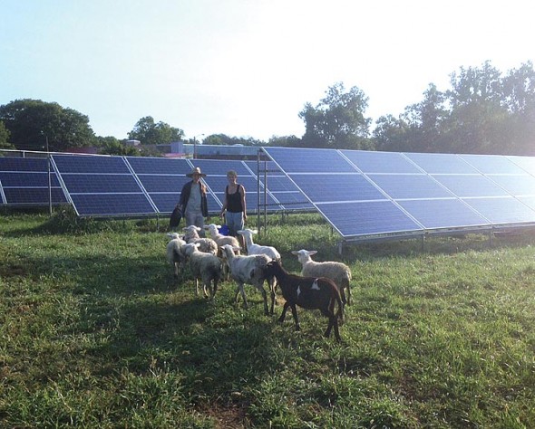 The Antioch College Campus Landscape Master Plan specifies management without the use of synthetic fertilizers or pesticides. Native plantings and bio-retention methods are used across the campus, which, along with the Antioch Farm, serve as learning spaces as well. The Antioch Farm, which comprises nine acres of growing and grazing land, uses campus leaves, vegetable dining scraps, animal manure, and other local “waste” products to create a nutrient-rich soil. Farming methods used at the farm meet the USDA organic standards, and are also informed by ecological, biodynamic, and permaculture practices. Innovative practices, like the college’s solar sheep — that is, sheep who graze the grass on the college’s solar farm and take shelter under the panels — provide multiple benefits to the landscape and students’ learning.