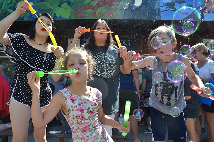The sixth annual Bubblefest attracted bubble-blowers from near and far, who lined the streets for an hour reveling in the orbs that drifted down the sidewalk and popped on passing cars. Here local resident Ginger Spaugy enjoyed some good clean fun with her grandchildren, from left, Rayna, Jaidyn and Vanny. Kate Mooneyham of Dark Star Books organized this year’s Bubblefest, which was started in 2013 by villagers Douglas Klappich and Deborah McGee as a “fun event with absolutely no agenda of any kind.”