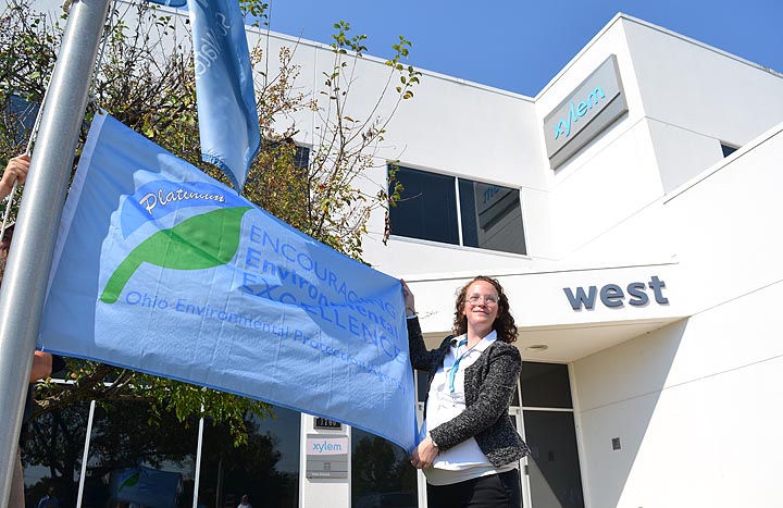 YSI Senior Scientist Jessica Moyer displayed the flag the company received for an Ohio EPA Encouraging Environmental Excellence award at its Brannum Lane facility. YSI received the highest level — platnium —for its work to conserve resources at their facility and in the wider community. YSI, now owned by Xylem, is a 70-year-old local company that designs and manufacturers water sampling and monitoring instruments used around the globe and in the region, including by the Ohio EPA. (Photo by Megan Bachman)