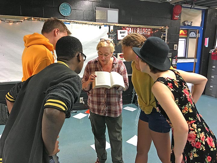 Yellow Springs High School/McKinney School performing arts teacher Lorrie Sparrow-Knapp directed students in English teacher Desiree Nickell’s class as they studied “Romeo and Juliet” recently. From left to right are students Dezmond Wilson, Matt Duncan, Carina Basora and Vera Roberts. Shakespeare’s classic work is one of two plays being performed as part of the Bulldog Theatre Festival. The first play, “Girls Like That,” runs Nov. 2–4; “Romeo and Juliet” is the following weekend, Nov. 9–11.(Submitted photo by Desiree Nickel)