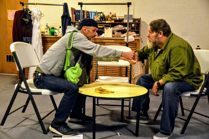Robb Willoughby, left, and Troy Lindsey rehearse a tense scene from “Bro” over a pair of aging bananas in the Sunday school room at First Presbyterian Church. “Bro” is one of the short plays that will be performed as part of the YS Theater Company’s production of “W3 — Three Humorous Tales of Horror,” opening this weekend, Friday–Saturday, Oct. 26–27, at 8 p.m. and continuing the following weekend. (Photo by Lauren “Chuck” Shows)