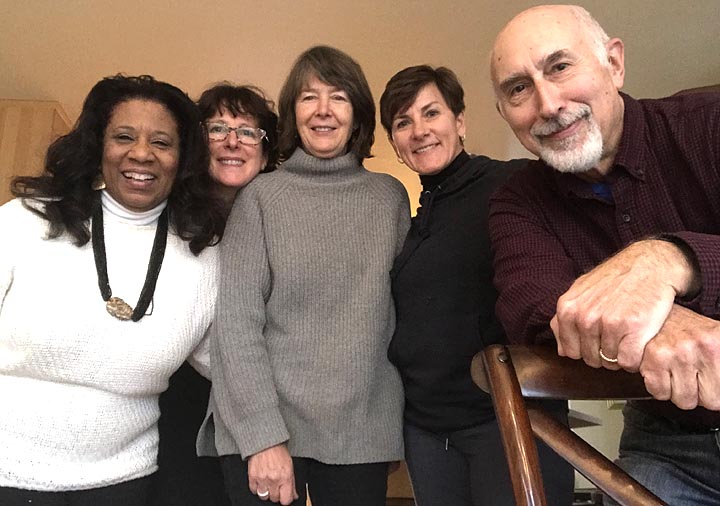 The Yellow Springs Community Foundation recently launched the Encore Miller Fellowship, through which local retirees and “late-career” villagers mentor Antioch College Miller Fellows and support collaboration among local nonprofits. Jeannamarie Cox, executive director of the Community Foundation (center), met recently with the first group of Encore Fellows, at left, Jalyn Roe and Kat Walter, and, to her right, Melissa Heston and Len Kramer. (Submitted photo)