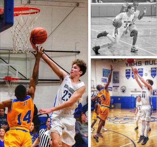 The boys varsity basketball team in action on Friday, Jan. 11: (clockwise from left) DeAndre Cowen goes up for a layup; Andrew Clark deftly moves the ball down court; Trey Anderson shoots a three-point basket. The Bulldogs bested the Jefferson Township Broncos 51–47. (submitted photos by Mike Knemeyer)
