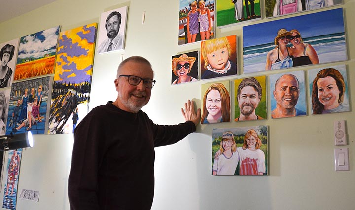 Local artist Tim Potter, shown here in his home studio with his portraits of family members in the background, will show about 50 portraits of villagers at The Winds Café this month and next. An opening reception for the exhibit takes place Sunday, Jan. 27, from 4 to 6 p.m. (Photo by Diane Chiddister)