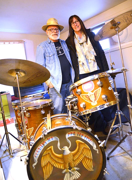 Dewey’s drums, which he bought in 1967, feature on the kick drum a still gorgeous hand-painted version of Country Joe and the Fish’s logo. It was drawn by the same artist who detailed the album covers of the Youngbloods, which Dewey first saw perform at Antioch in 1965.