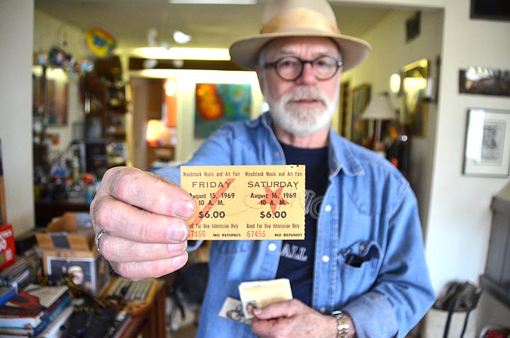 Duke Dewey and the drumset he used at Woodstock Music and Art Fair, where he performed with Country Joe and the Fish. Below: Dewey holds a ticket stub from the historic music festival. (Photo by Megan Bachman)