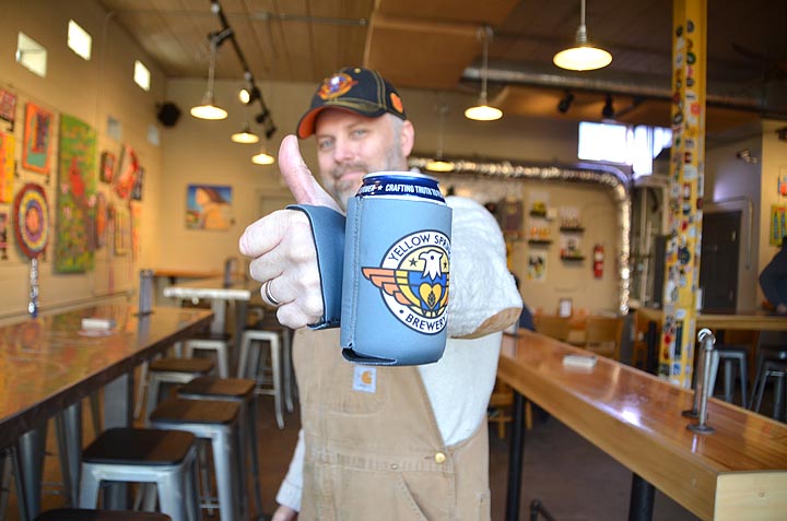 The patent is pending for local entrepreneur Jon Horvath’s latest invention, The Can Hand, an ingenious way to hold a beverage while keeping one’s fingers free for other tasks, such as texting or holding an umbrella. Horvath will host an open launch party for The Can Hand at Yellow Springs Brewery on Saturday, March 2, from 4 to 8 p.m. with games, raffles and refreshments. The brewery was Horvath’s first customer and will start selling their logo-printed Can Hands this weekend. (Photo by Megan Bachman)