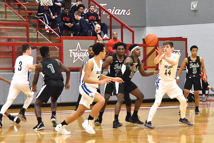 On Wednesday, Feb. 27, the boys varsity Bulldogs traveled to Troy High School to take on Springfield Catholic Central in the team’s first postseason game. The Bulldogs started strong and held the Irish to a 5–5 tie for most of the first quarter. But despite the scoring efforts of Andrew Clark and DeAndre Cowen, who contributed 14 and 11 points respectively, and strong play from the entire team, the Catholic Central Irish pulled ahead in the second quarter and maintained an insurmountable lead for the rest of the game. “We were just a couple of plays from staying in that game — couple of made shots, couple of loose balls, couple of rebounds,” said Bulldogs head coach Bobby Crawford. But ultimately the YS boys came up short, losing to a strong Catholic Central team 53–33, and finishing their season. Right: Trey Anderson passes to an open Dmitri Wallace, while Andrew Clark evades the Catholic Central defense. (Photo by Eleanor Anderson)
