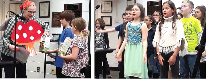 Members of two Mills Lawn classes separately addressed the school board during its meeting Thursday, March 14. LEFT: Third-grade teacher Peg Morgan, aka “Trevor, a Yellow Springs mushroom,” speaks with third-grade student-scientists Bryce Fleming and Kaitlyn Macduff about the importance of mushrooms to healthy soil. RIGHT: Fourth-grade students of Carrie Juergens performed an original rap as part of their proposal that Mills Lawn cafeteria eliminates plastic flatware in favor of metal. One verse begins: “In the underwater world there is plastic by the ton. And if by 2040 plastic is not done, the underwater world will be more plastic than fish, floating around the ocean; flip the switch.” (See the March 21, 2019 school board article, School Board—Superintendent search begins)