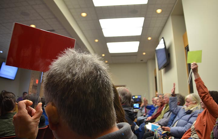 Some brought small handmade signs colored green on one side and red on the other, or with smiling faces on the front and frowning faces on the back, using them occasionally during the meeting to signal their support or disapproval of a comment made by a Council member or fellow citizen. There was also occasional clapping in support of a public comment.