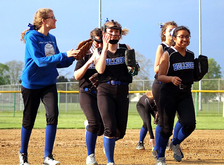 In an away game against Dayton Ponitz on Monday, April 29, Bulldog teammates Harvest Lechler, left, and Sara Zendlovist, far right, congratulate shortstop Lily Rainey, center, as she runs off the field after recording every out in the inning — including an unassisted double play on a popup. (Photo by Coach Jimmy Delong)
