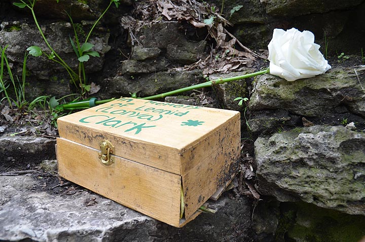 A heartfelt memorial for Leonid “Lonya” Clark appeared last week at a popular gathering rock in Glen Helen Nature Preserve. A white rose was added to the spot this week. Clark’s body was found in the Glen on April 12, and the Greene County Sheriff’s Office is investigating his death as a homicide. (Photo by Carol Simmons)