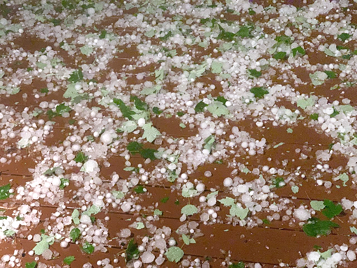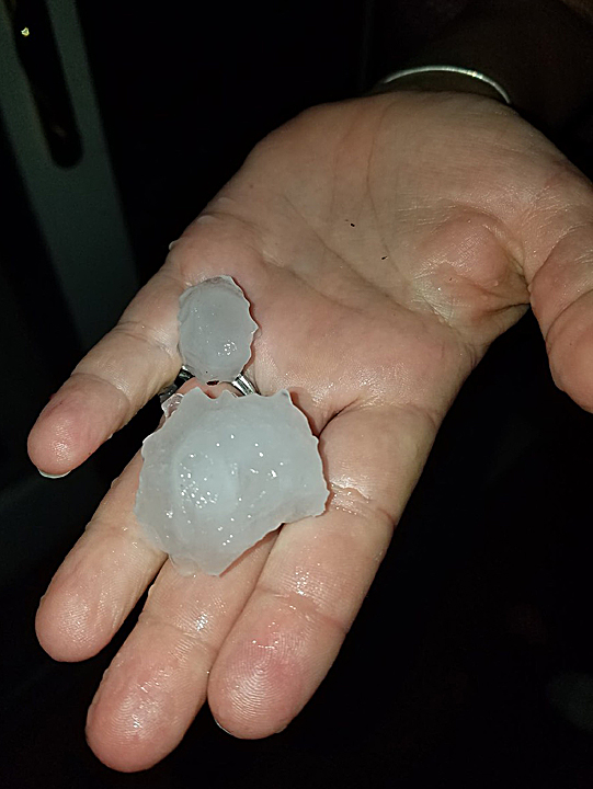 Village resident Bryan Cady holds two large hailstones that landed on his back porch Monday evening.