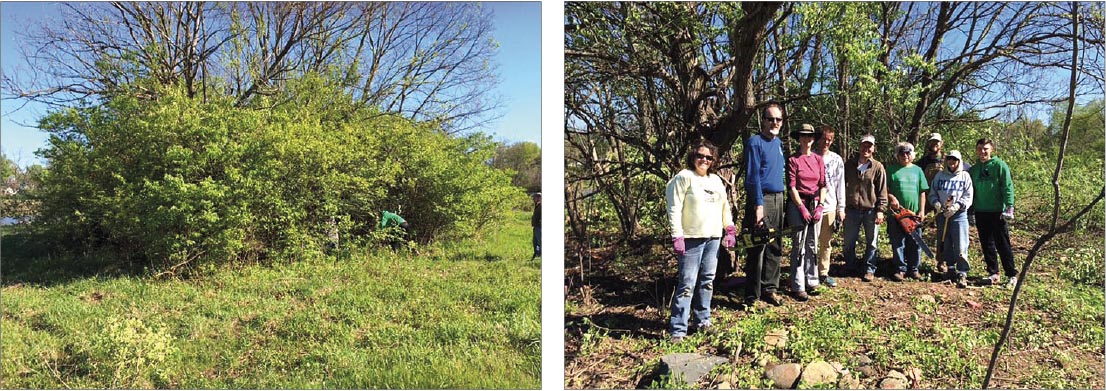 Tecumseh Land Trust has removed about four acres of invasive plants from the 8-acre Glass Farm conservation area off King Street. Left, a clump of honeysuckle, autumn olive and bittersweet. Right, the same area after TLT Associate Director Michele Burns and team cleared away the invasives. Both photos were taken on the same day during a work session on the property two years ago. (Submitted photos)