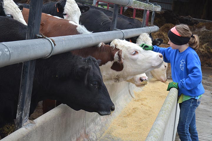 Kate Marshall pet some cows as they finished on grain. The seven-year-old loves caring for the animals — it’s hard to get her inside. (Photo by Megan Bachman)
