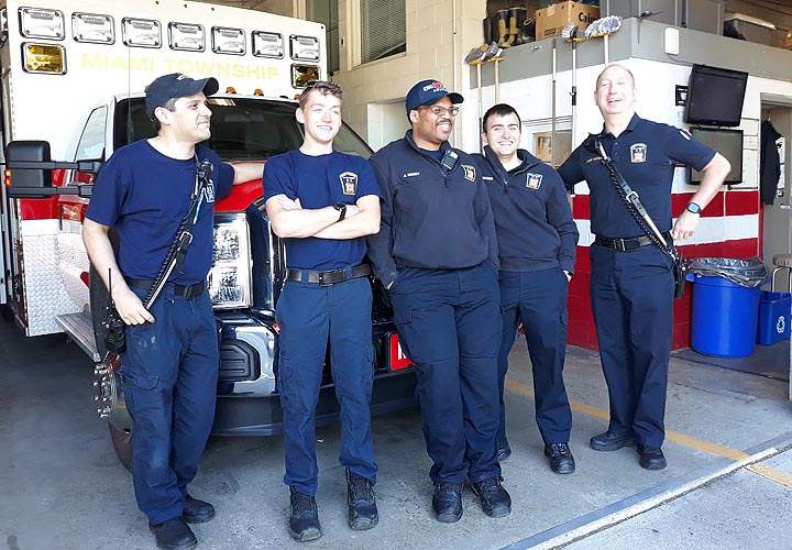 Local fire and emergency medical service personnel and law enforcement officers are paying closer attention to the secondary trauma experienced by first responders in the line of duty. Ready to answer the next emergency call on a recent Tuesday morning was a five-person Miami Township Fire-Rescue crew, from left, recently promoted Lieutenant Joe Panuto, Explorer Gavin Sweet, firefighters/EMTs Josh Sweet and Cassady Brewer and Chief Colin Altman. (Photo by Carol Simmons)