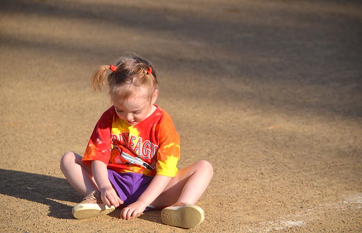 Laurelai Myers, 3, is sitting in the dust next to the third base bag. Her dad, John Myers, is there with her. John volunteers to be our third base coach all evening — we have a volunteer on all three bases. Kids often don’t know where to go, so we tell them where to go — from first to second, from second to third, from third to home — after the batter hits the ball off the tee. We get each child’s name, and tell each other what the kid’s name is as we send him or her on to the next base. This name thing and telling kids where to go are essential ingredients for a successful night of T-ball, because most of the children know little or nothing about baseball. I told Aspen Reitsman, 4, to touch her toe to the home base plate, telling her this gave her a run. “A what? You want me to run?” she asked. She had just run around the bases. Now she is to run again? “No, no,” I said, explaining that a “run” was a “point” her team earned when she came home. “Came home?” “This is called home,” I said about home plate. “You get here, you touch the home plate with your foot or toe and you earn a point — a ‘run.’”