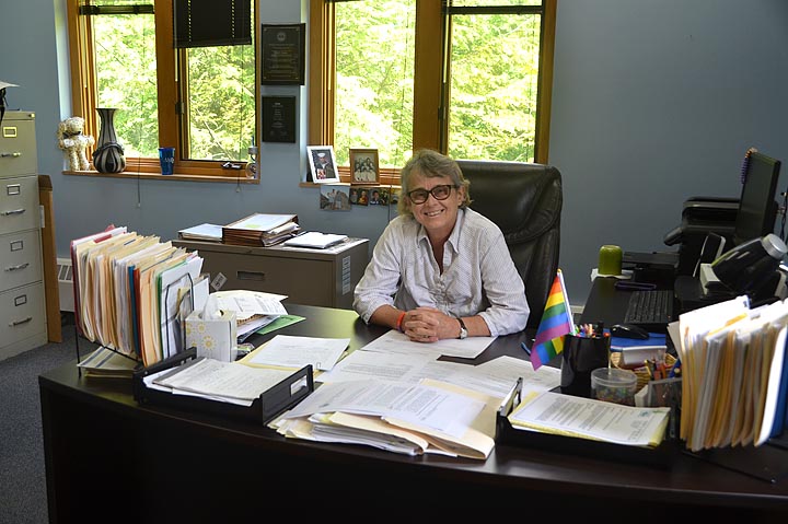 Patti Bates departs the Village’s top job at the end of June. The outgoing Village manager recently sat at the desk where she worked for the last five years. (Photo by Megan Bachman)