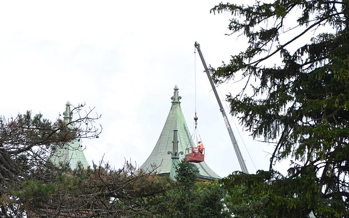 Last week, ahead of a thunderstorm, a worker braved the heights of Antioch’s Main Building to repair wind damage on one of its copper spires.