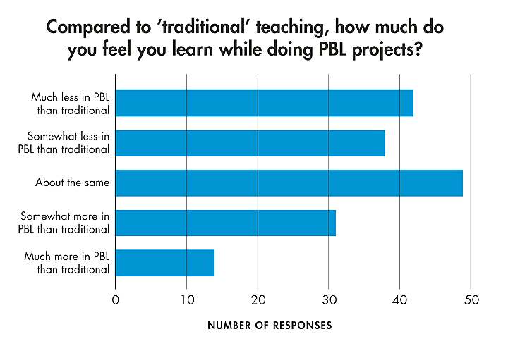 Twenty-eight percent of respondents felt that PBL did not significantly improve their learning, reporting that they learned “about the same” compared to traditional schooling. Forty-six percent of respondents felt they learned somewhat less or much less than in traditional schooling, while 26% reported they learned “somewhat more” or “much more” in PBL compared to traditional.