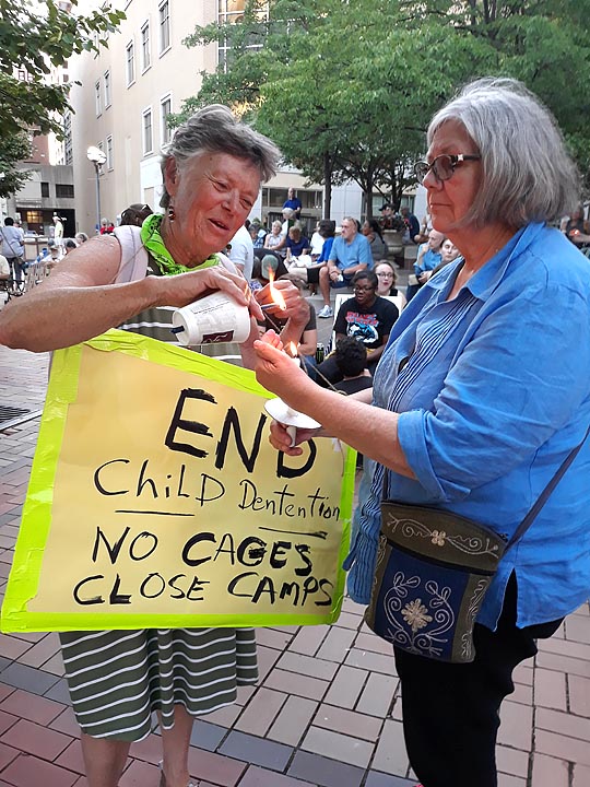 Yellow Springs was well represented Friday, July 12, as an estimated 300-some people from the Dayton area gathered in that city’s Courthouse Square as part of a nationwide vigil seeking the closure of immigrant detention camps in the U.S. Members of the locally based World House Choir also led the gathering in rallying songs. Participants held lighted candles for two minutes of silence to conclude the two-hour action billed as “Lights for Liberty.” A number of Antioch College alumni, in town for the annual reunion, assembled at the same time with candles outside the Coretta Scott King Center on campus. Villager Pat Dewees, left, lights the candle of retired Rev. Lynn Sinnott, of Cedarville, in Dayton.