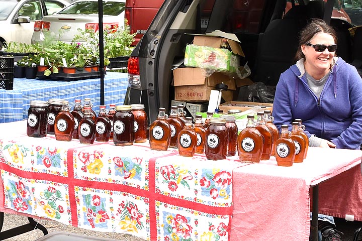 Yellow Springs Farmers Market coordinator Michele Burns sold maple syrup at her stall at the weekly market earlier this season. More recently, her Flying Mouse Farms booth has also featured greens, beets, broccoli and cauliflower. Burns sees the farmers market as a key part of the local food system. (Photo by Luciana Lieff)
