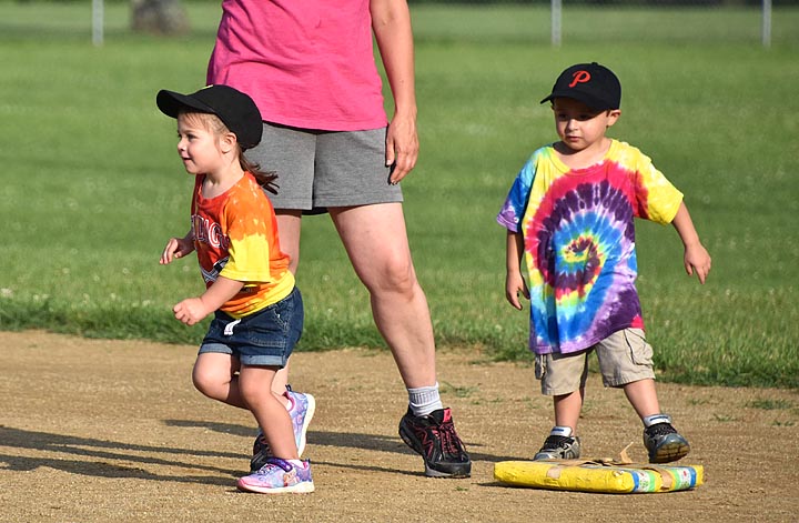 Miniature Ella Bistline, 3, her bat longer than she is tall, surprises and delights me with a windmill swing. What she does is wind up to swing by twisting around at the waist until she is almost twisted in half like a pretzel, so she has to look back over her shoulder to see the tee. Then not looking at the ball or tee, she unleashes herself, whirls around, bringing that bat with her — and about every fifth or sixth unleashing-whirl-around swing, she hits the ball and it is suddenly sizzling across the diamond, sending it through the feet of the dozen children standing, waiting, hoping, in the middle of the infield. And then her twin Parker, 3, comes to bat and he swings and misses, and swings and misses, and swings and misses, and swings and misses — you get a thousand strikes in T-ball — and on his 411th swing, he finds his target. In the blink of an eye, he’s racing lickety-split to first base.