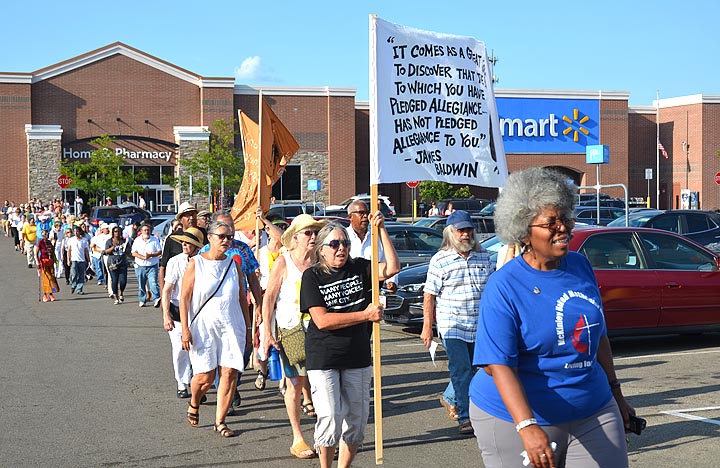 On a hot Monday evening, at least 100 people gathered outside the Beavercreek Walmart for a memorial on the fifth anniversary of John Crawford III’s shooting death at the store. The event was organized by villager Yolanda Simpson. While police were not indicted for the killing, a civil trial related to the incident is due to start in Dayton, on Oct. 28. (Photo by Audrey Hackett)