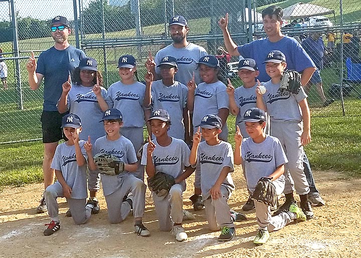 The Nipper’s Corner Yankees made a clean sweep of the 2019 Minor League championships with a 19–8 win over the Sam and Eddie’s Open Books Brewers in the post-season championship game on Saturday, July 27. It was the ninth straight win for the Yankees, after starting the season with losses in four of their first five games.