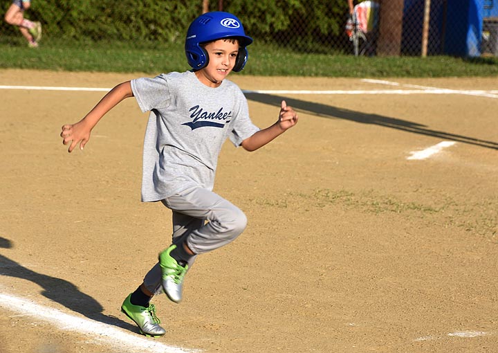 Marc Meyer of the Nipper’s Corner Yankees sprinted to first during the semi-finals on Wednesday, July 24. The Yankees snuck by the Dodgers to make it to the championship game. (Photo by Luciana Lieff)