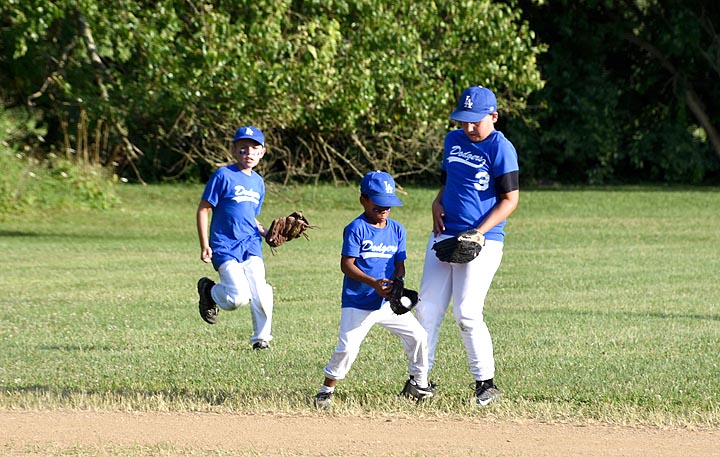 The Peach’s Dodgers lost to the Nipper’s Corner Yankees in very close semi-final game 9–8 on Wednesday, July 24. Above, Jacob Obringer, Ezra Lydy and Ben Morris of the Dodgers show some fast fielding action. (Photo by Luciana Lieff)