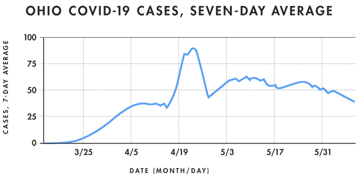 Since the beginning of May, Ohio has opened its economy apace after swift business and school closures and stay-at-home orders were enacted in mid-March to slow the spread of COVID-19. State leaders have pointed to those actions as having “flattened the curve” of infections and avoided overwhelming hospitals and ICU capacity.