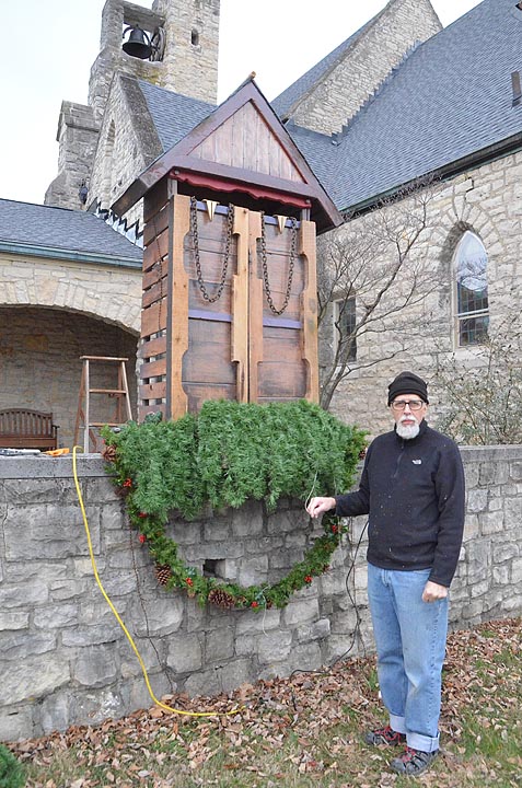 The Madonna and Child figures created by Brian Millar’s mother almost 70 years ago adorn the creche he built outside the First Presbyterian Church. (Photo by Matt Minde)
