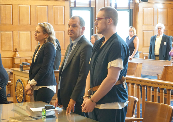 Zyrian Atha-Arnett stood with his defense lawyer, Jon Paul Rion, during his sentencing Wednesday, July 21, in the 2019 stabbing death of Leonid “Lonya” Clark. Atha-Arnett pleaded guilty to involuntary manslaughter as part of a plea deal with the Greene County Prosecutor’s Office, and was sentenced to 15 years in prison for that and other charges. (Photo by Carol Simmons)