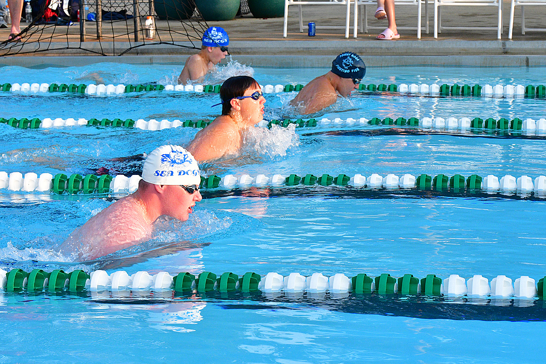 The Yellow Springs Sea Dogs competed against Forest Ridge at the championships at Greene Valley Pool on Thursday, July 22. Pictured are Stephen Dunn, foreground, Luke Guisleman, farthest lane, and Evan Galarza, leading the pack, competing in the boys 50-meter breast stroke. (Photo by Kathleen Galarza)