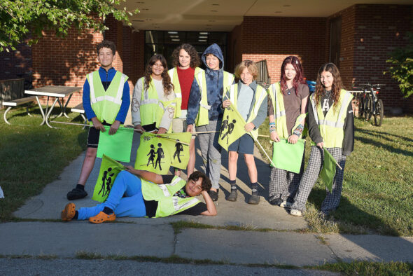The safety patrollers on the scene in front of Mills Lawn Elementary on Tuesday, Sept. 2, were, from left, sixth-graders Francisco, Elyse, Amandine, Isaiah, Timmy, Roxanne and Ellie. On the ground is Luke. (Photo courtesy of Yellow Springs Schools)