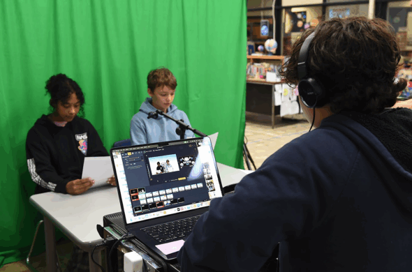 Now, every school day, a rotating group of four sixth graders — two anchors and two technical crew — go live at 8:05 a.m. in the school’s STEM classroom. Working together under the direction of STEM teacher Megan Bachman, the Bulldog News team brings weather, lunch menus, meeting and birthday announcements, school election results, special guests and more to their Mills Lawn community.