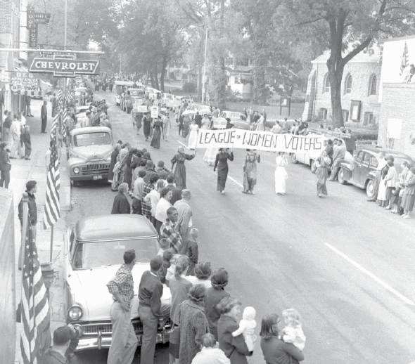 Oct. 1956: “THE LEAGUE OF WOMEN VOTERS’ marching unit in the centennial parade was named as the ‘best’ group, the First Baptist Church’s float as the ‘best’ in that classification and Louise Odiorne and Ed Carr’s bicycle-built-for-two (with Hobart Waits substituting of the way for 87-year-old Ed) as the best individual. League members in front, left to right, are Mrs. G. Ray Noggle, Mrs. William Warren, Miss Ann Cannon, Mrs. Frank Burrer, Jr. and Mrs. Art Landes.” (YS News archive photo by Jon Ott)