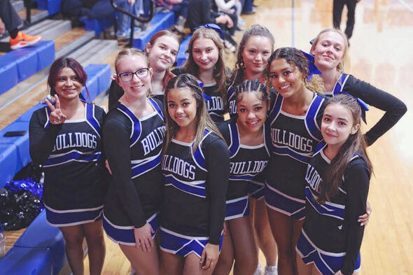 The Bulldogs cheerleading squad posed for a quick pic at the boys varsity match against Southeastern on Wednesday, Nov. 26. Back from left: Lily Locke, Malorie Lininger, Raquel Harris-Hall and Petra Nieberding. Front: Joselyn DeLaSancha, Olivia Ward, Lilliana Sylvester, Paradise Everhart, Addison Shafeek and Maddie Allen. (Photo by Jyoti Miller)