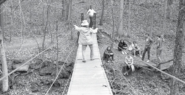 Glen Helen’s long lost, but fondly remembered hanging bridge over the Yellow Springs Creek still swings in the memories of many village locals. Present Glen Director Nick Boutis said earlier this week the bridge was likely one of the pet projects of former director Ken Hunt as he developed the trail system throughout the preserve in the 1940s and ‘50s. Over the decades, there were several bridges constructed at this location — each designed to be sturdier than the last, but vulnerable to vandalism, Boutis said. The last bridge was demolished some time in the late ‘90s or early aughts. (News archive photo, 1985)